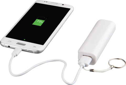 The Span 1200 mAh Power Bank contains a rechargeable lithium-ion battery for charging smartphones, MP3 players, and other devices. It also features a key ring for easy carrying, as well as a USB-to-Micro-USB charging cable. Power banks are permitted in carry-on luggage only, and at the discretion of TSA agents. Please charge power bank before initial use. Comes packaged in a FSC®-certified premium gift box. 3.56" D x 1.18" W x 0.81" H