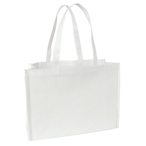 Reusable shopper tote made of durable eco friendly 80 GSM non-woven polypropylene material which is made from 10% post-consumer recycled content, which is also recyclable. Features include spacious open tote with box gusset and crisp binding edge seams and reinforced handles, 22" in length. Recommended weight tolerance: 11 lbs. Production time may vary due to imprint method. Complies with Prop 65. 16" W x 12" H x 6" D