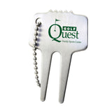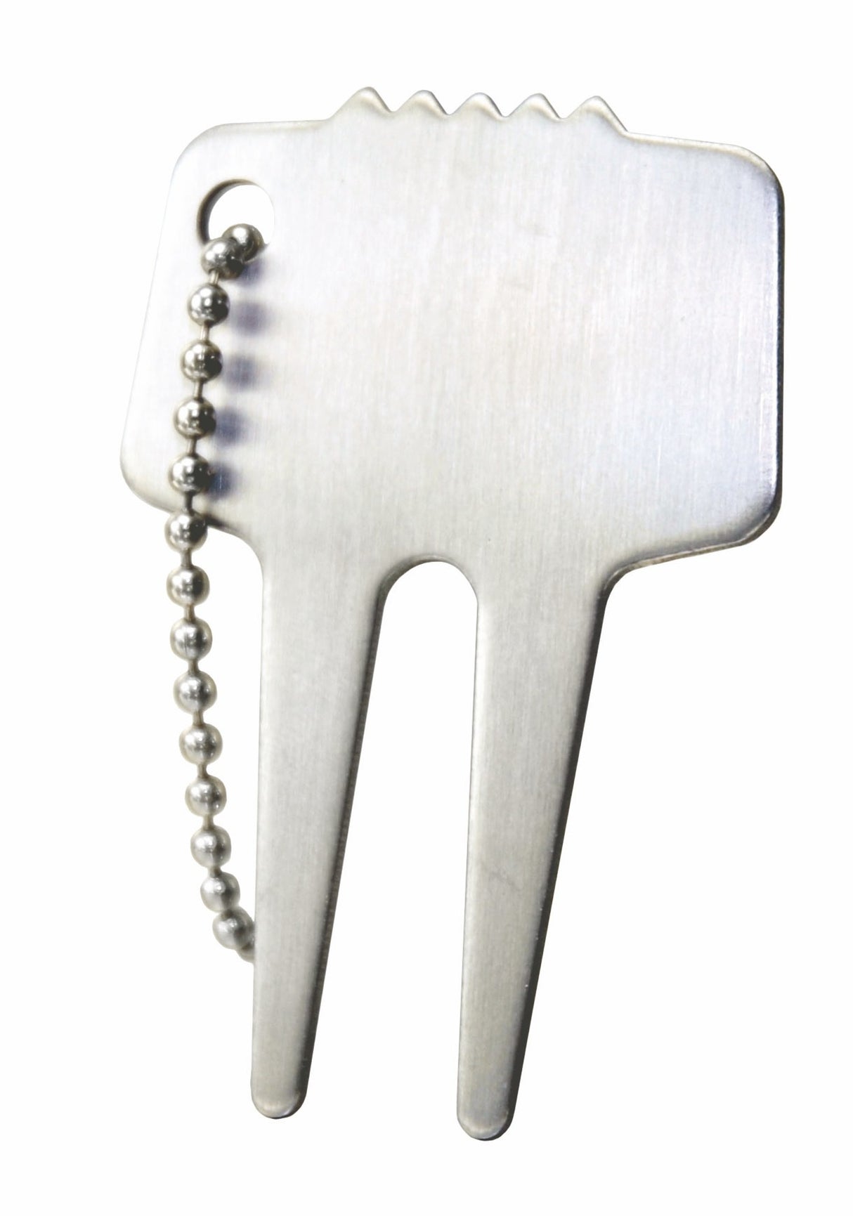 Steel divot tool with chain. These affordable golf gifts make perfect giveaways for trade shows as well as golf outings and tournaments. Complies with CPSIA. 2 1/4" H x 1 1/2" W