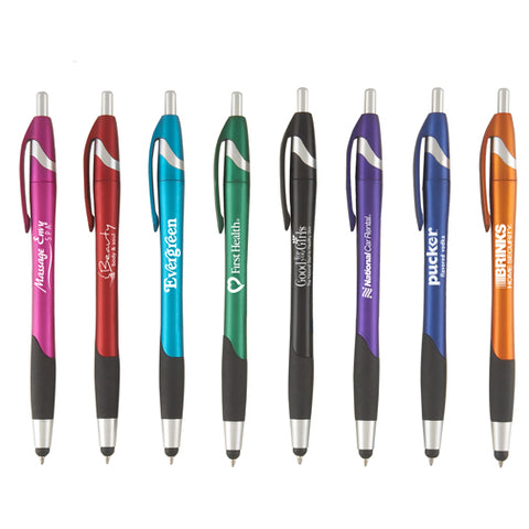 Iron out all the kinks in your marketing plan with the Stratus Stylus with Grip! The iconic design of this medium ballpoint plastic pen features smooth curves, a grip, matching colored barrel and a pocket clip with crisp silver trims. It comes with black ink and you can add your company name, logo and contact information to it to complete the look. Create an amazing promotional tool that will help you get your brand the recognition that it deserves! Complies with Prop 65. 5.7" L x 0.33" W