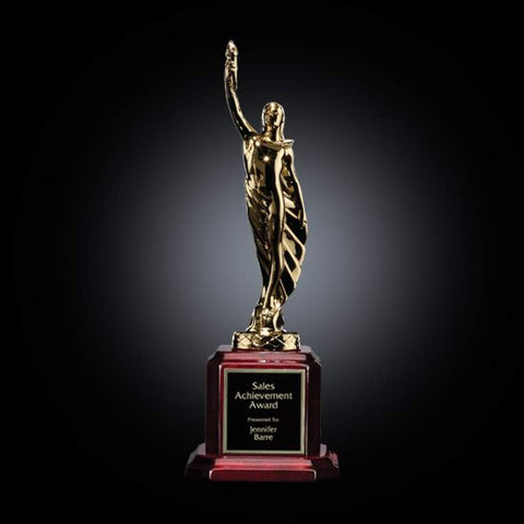 The action captured in the swirling garments and victorious pose of our Supremacy gives artistic drama to your award as the figure proudly raises it's beacon to your accomplishment. Available in silver or gold, mounted to our rosewood piano finish wood base.