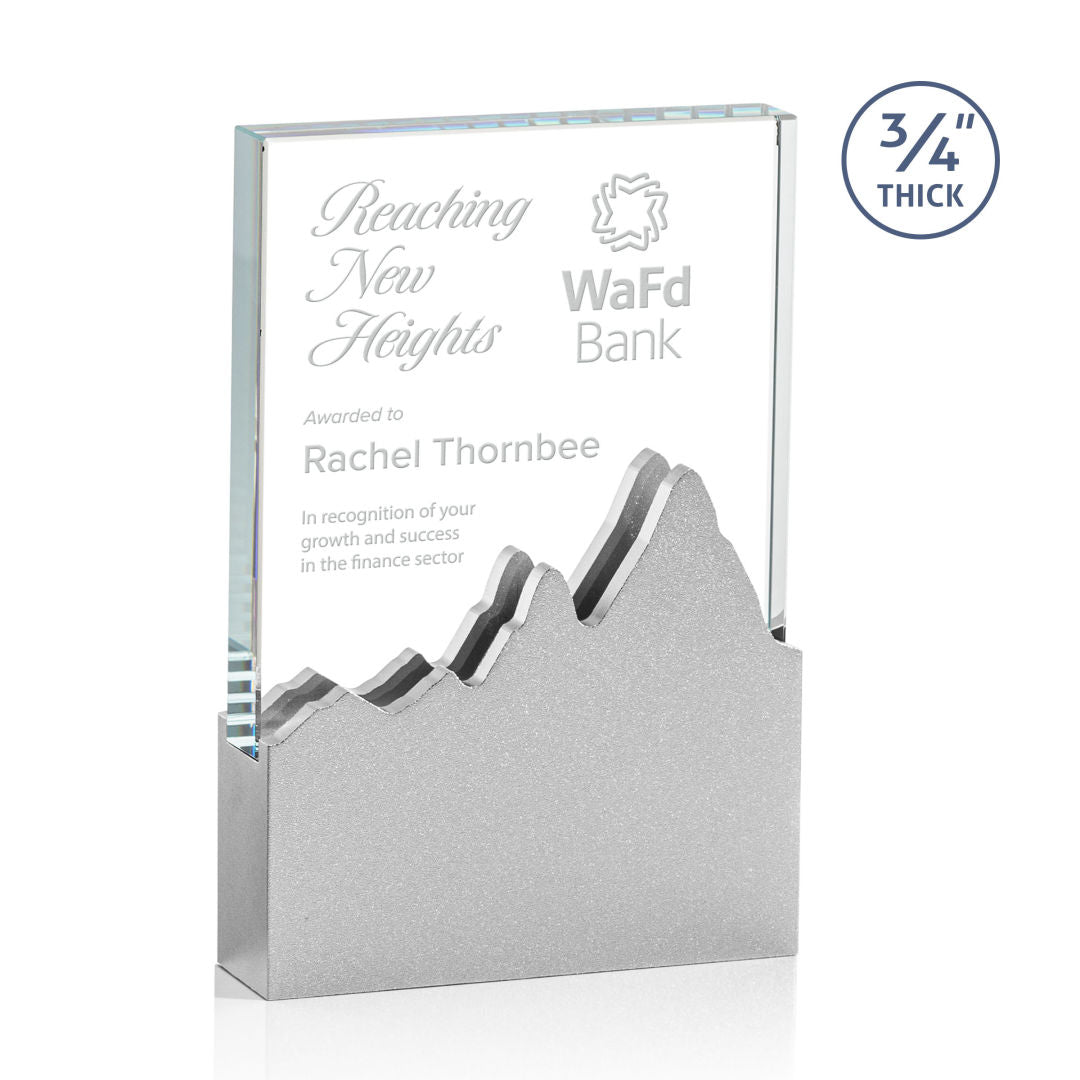 The ultra contemporary Sutton award features an extra thick 3/4" Starfire Crystal block that sits nestled inside a metal base. The base is designed with a double sided mountainscape silhouette in 4 vibrant metallic colors. Metal base can be flipped to show mountain range reversed.
