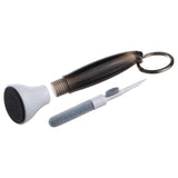 Swab Microfiber Earbud + Screen Cleaner with Key Ring allows you to clean on-the-go. The 4-in-1 cleaner includes: * Pen tip for cleaning in smaller ports and grooves * High-density brush to clean sound outlet holes on earbuds * Flocking sponge to clean inside charging case * Microfiber pad on bottom of outer case for screen cleaning. The cleaning tool fits inside a plastic ABS case that screws together. Handy key ring attaches cleaner to keys or bag for convenience. Complies with Prop 65. 3.625" H x 1.125" Diameter