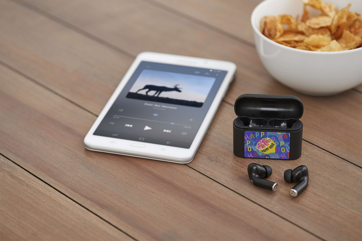 The tempered glass on the surface offers a vivid customized look for these True Wireless Earbuds. Once the True Wireless Earbuds are removed from the charging case they automatically power on and pair to each other! Once connected the earbuds will provide 4hrs of premium sounding audio at max volume! With built in touch controls all you need to do is tap the earbud to accept a call or change the audio. The built in microphones allows for a crystal clear call. The charging case will charge the Tr. 0.95" D x 2.12" W x 2.55" H