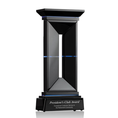The Traviata Award is an assemblage of hand cut ebony optical crystal with angles built to frame a sliver of light creating a sculpture of epic proportions. Narrow layers of aqua blue crystal accents give glints of color and light to this contemporary award.