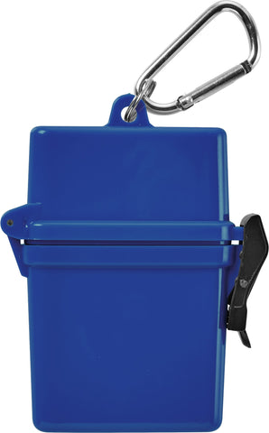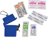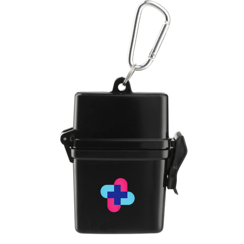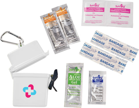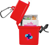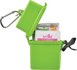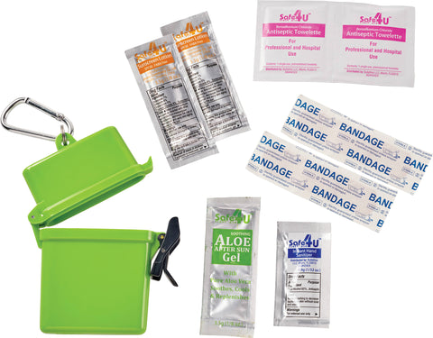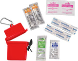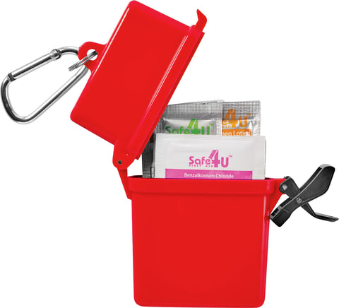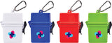 The Bullet Trek 8-Piece Waterproof First Aid Kit is a mini first-aid kit in a flip-top waterproof floating container. This kit includes a metal mini-carabiner for convenient first-aid care. This portable first-aid kit includes two adhesive bandages, two antiseptic wipes, a Hand Sanitizer packet, two SPF30 Sunscreen packets and one packet of aloe/after sun care. The sunscreen in this convenient kit does not contain Octinoxate or Oxybenzone. The Bullet Trek 8-Piece Waterproof First Aid Kit meets FDA requirements and is available for shipment within the United States (including Alaska, Hawaii, and Puerto Rico).See General Information page for additional air shipment charges. Not available in Canada. 0.59" D x 3.34" W x 4.21" H