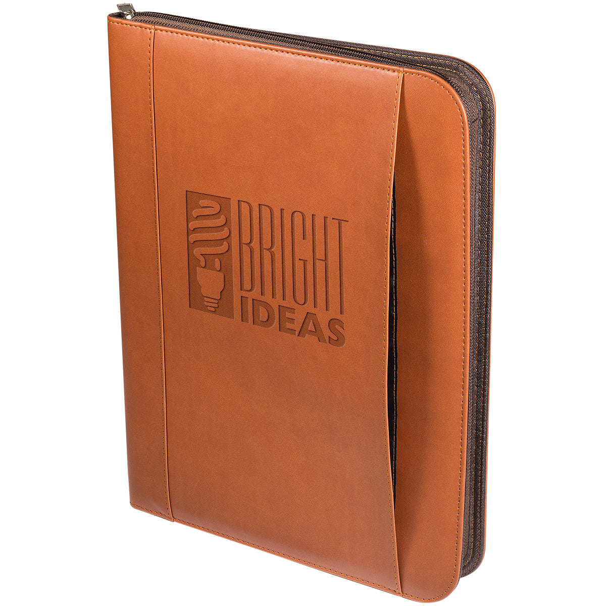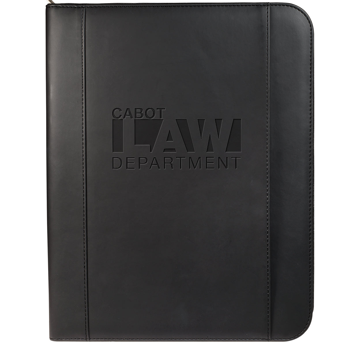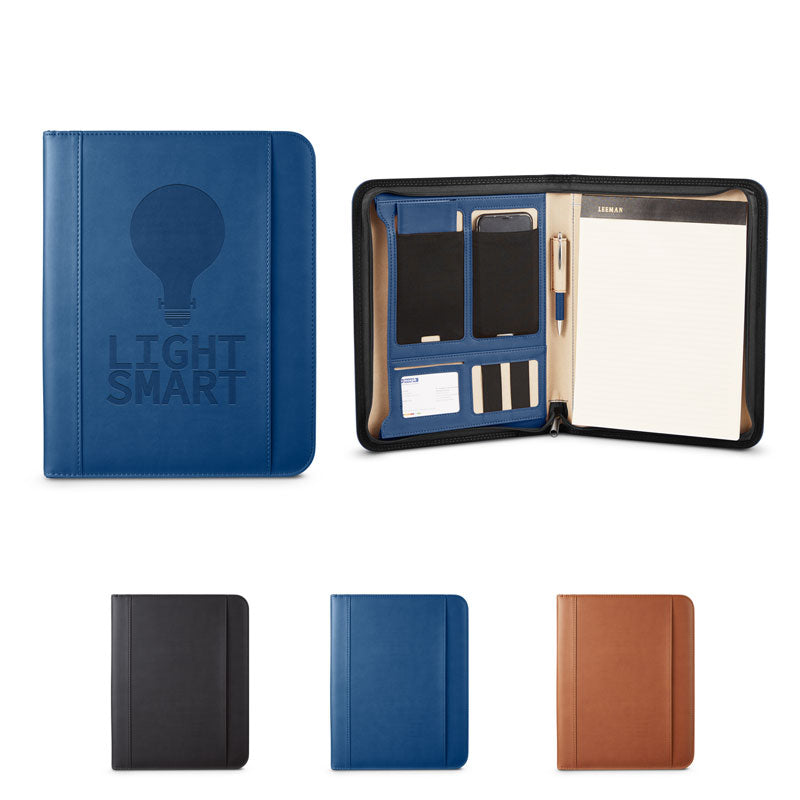 This elegant full zip hard cover Padfolio with cover made of soft faux leather Italian PU has a front open pocket and Leeman™ logo subtly debossed on the back cover. Also includes ID slot (3"w x 2"h) and cable organizer (3.5"w x 2.33"h) on the inside cover. Pen is sold separately. Gift Box dimensions: (10.5"w x 13"h x 1.2"d). Complies with Prop 65. 10.23" W x 13" H x 1" D