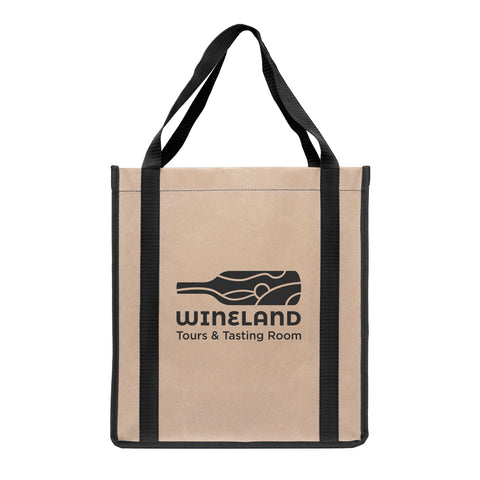 Our Vancouver Eco reusable bag is made with eco-friendly kraft paper reinforced with nonwoven fabric, and features long webbed polyester handles. With its eco-friendly materials, natural look & feel, and great reusability, this tote bag is a great new eco-friendly option. Customize with your 1-color silkscreened logo. Complies with Prop 65. 13.94" W x 15.04" H x 6.61" D