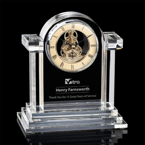 Exquisite Optical Crystal clock with gold skeleton movement. A perfect gift for the home or office.