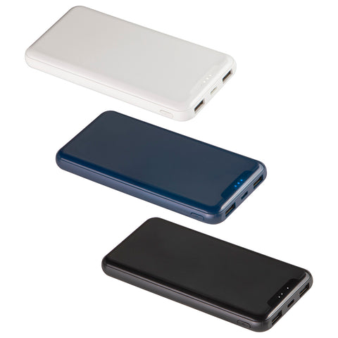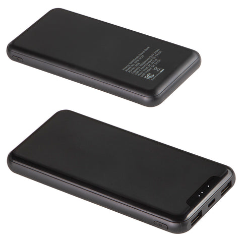 Powerful 10000mAh capacity power bank capable of charging on the go. Charges 3 devices simultaneously with two USB ports & 1 USB Type-C port to charge everyone's devices. Includes on/off power button and power level indicator lights so it's easy to tell when charging is complete. Includes Micro USB charging cable. Large surface for imprint and a great competitive price! Complies with OU, UN38.3. 5.625" L x 0.625" W x 2.625" H