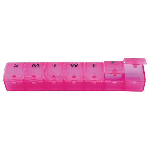Weekly pill dispenser. A traveler's necessity and a life-saver at home. Be organized for the week one day at a time. Complies with CPSIA, Prop 65. 7/8" H x 6" W