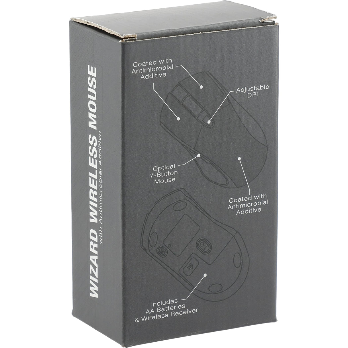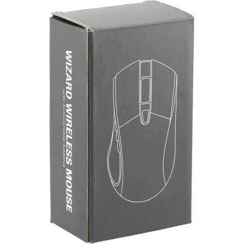 The seven button Wizard Wireless Mouse with Antimicrobial Additive will prevent germs from growing on your mouse over time. The Wizard wireless mouse includes a built-in USB receiver that makes it compatible with all major operating systems. Simply plug in the USB receiver and the mouse is ready to use. No set-up is needed. The mouse features three adjustable DPI levels (800, 1200, & 1600). The ergonomic design makes it easy to be used throughout your day. One AA Battery is included. A premium gift box is included as the standard packaging option. 4.5" D x 2.5" W x 1.75" H