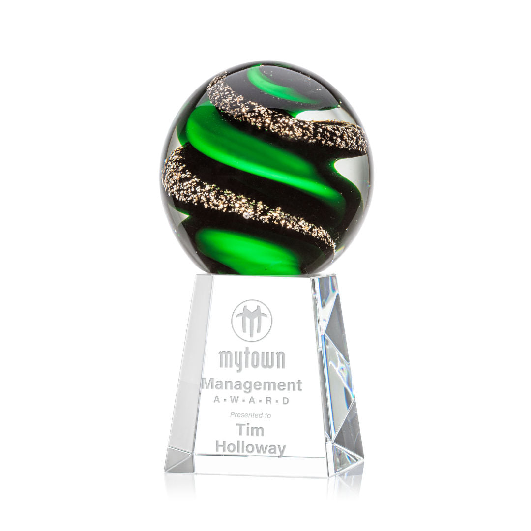 Magnificent Striking Zodiac Art Glass Award features twisting ribbons of emerald and glimmering black speckles. Mounted on a tall tapered Optical Crystal Base. Each piece is individually handcrafted and no two pieces are identical.